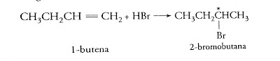 ● Pembentukan produk kiral dari reaktan akiral, contohnya: adisi hidrogen bromida pada 1-Butena menghasilkan 2-bromobutana (sesuai aturan Markovnikov):