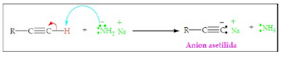Asetilena yang merupakan suatu alkuna sederhana dimana atom hidrogen yang melekat pada karbon yang berikatan rangkap tiga bersifat asam lemah karena adanya hibridisasi pada karbon yang menjadi lebih bersifat s dan kurang bersifat p. oleh karena sifat atom Hidrogennya yang merupakan asam lemah sehingga hidrogen ini akan lebih muda diambil oleh basa yang sangat kuat seperti Natrium amida (Na-NH2 ).