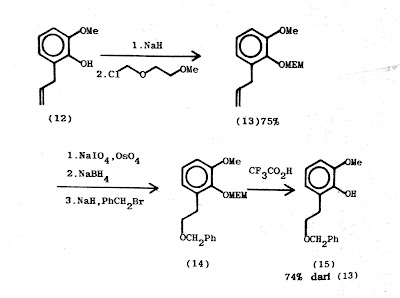 Pada reaksi berikut ini dilakukan proteksi gugus OH pada molekul yang mengandung lebih dari 1 gugus fungsional hal ini bertujuan untuk mensintesis asam gibberellat yang membutuhkan triol (15) yang mempunyai gugus OH bebas oleh karena itu perlu dilindugi dengan gugus MEM. Pada (13) terjadi ozonisasi ikatan rangkap, memasukkan dan melindungi gugus OH baru yang yang kemudian di deprotonasi dengan CF3CO2H untuk menghilangkan MEM.