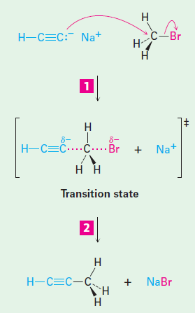 Setelah Amida mengikat hidrogen, dan hidrogen terlepas dari asetilena maka terbentuklah anion asetalida yang bermuatan negatif dan memiliki pasangan elektron bebas sehingga karbon ini dapat bertindak sebagai nukleofil kuat. Selanjutnya anion asetilida akan bereaksi dengan alkil halida seperti bromometana dengan terlebih dahulu membentuk keadaan transisi/intermediet, dimana elektron pada nukleofil menyerang karbon pada alkil halida yang terpolarisasi positif didalam bromometana dan adanya desakan elektron pada karbon (alkil halida) menyebabkan bromo (halida) terlepas dan mengikat Natrium menjadi NaBr. Sedangkan hasil reaksi antara nukleofil dan alkil menghasilkan produk berupa alkuna yang baru yakni Propuna.