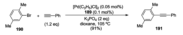 pada reaksi ini penggunaan aril bromida yang dikatalisis paladium berupa [Pd (C3H5) Cl] akan bereaksi dengan terminal alkuna yang akan menggantikan posisi bromida. menghasilkan senyawa baru berupa alkuna tersubstitusi.